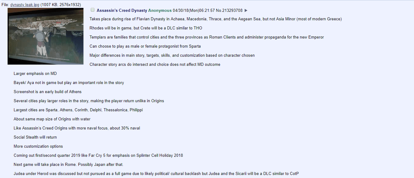 There has been an image and a bunch of information leaked onto the 4chan /v/ board about the upcoming Assassin’s Creed Game. Earlier this month it was also leaked that the next Assassin’s Creed game will be set in Greece. Now there is more evidence to back that claim up.