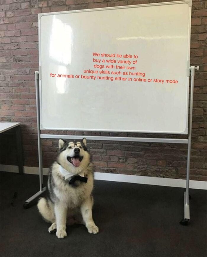 The image reads: “We should be able to buy a wide variety of dogs with their own unique skills such as hunting for animals or bounty hunting either in online or story mode.”