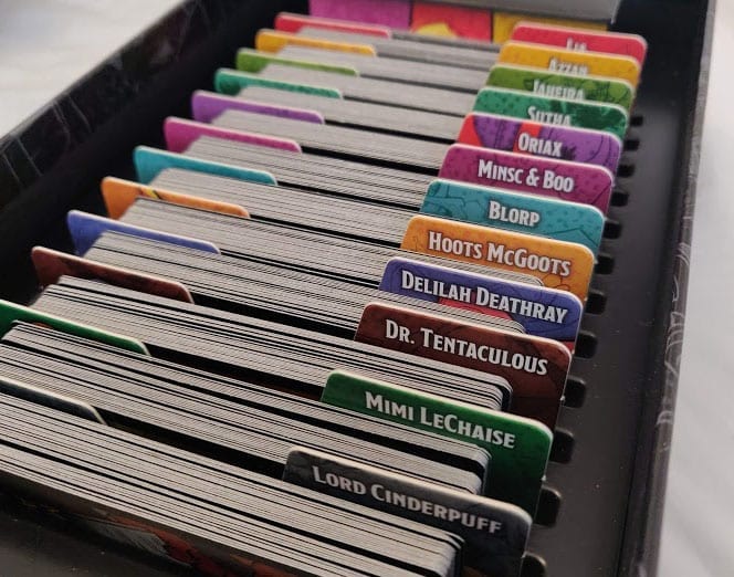 Dungeon Madness comes in a box large enough to store the original game and expansion if you have them, along with dividers for all 12 decks, extra tokens for the decks that don’t come with Monster Madness (so if you’ve lost any tokens from your original game, Dungeon Madness has you covered!) and a box to keep the tokens in. There’s something really satisfying about seeing them all together in the box, and the dividers make it easy for everyone to pick out a deck each time. Given that Dungeon Mayhem is the type of game you’ll play multiple rounds of, this really does help a lot.