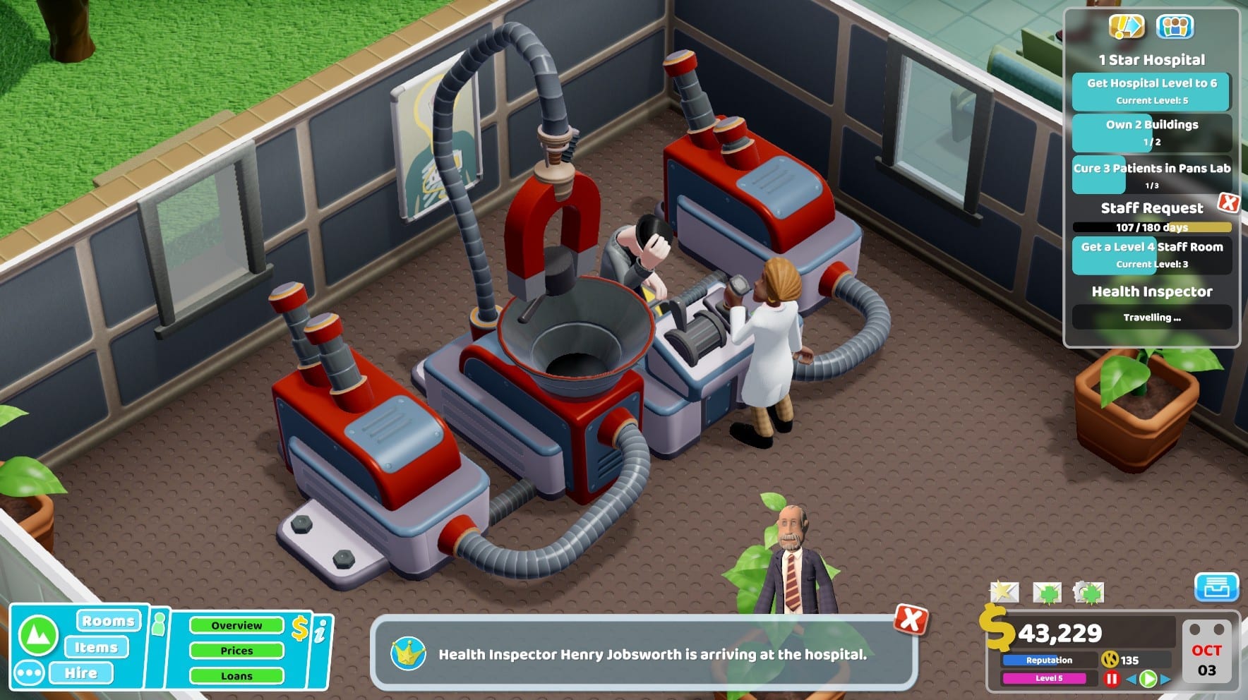 Each hospital can house multiple buildings and there are a plethora of patients, conditions and challenges just waiting to be tackled. Success means things like passing inspections, managing your money and raising the reputation of your hospitals. The game has a fantastic sense of humor and doesn’t take itself too seriously, which is good because this simulation is definitely not meant to reflect real life. Unless you’ve seen people regularly walking around with giant pans wedged on their heads…no? ….thought not.