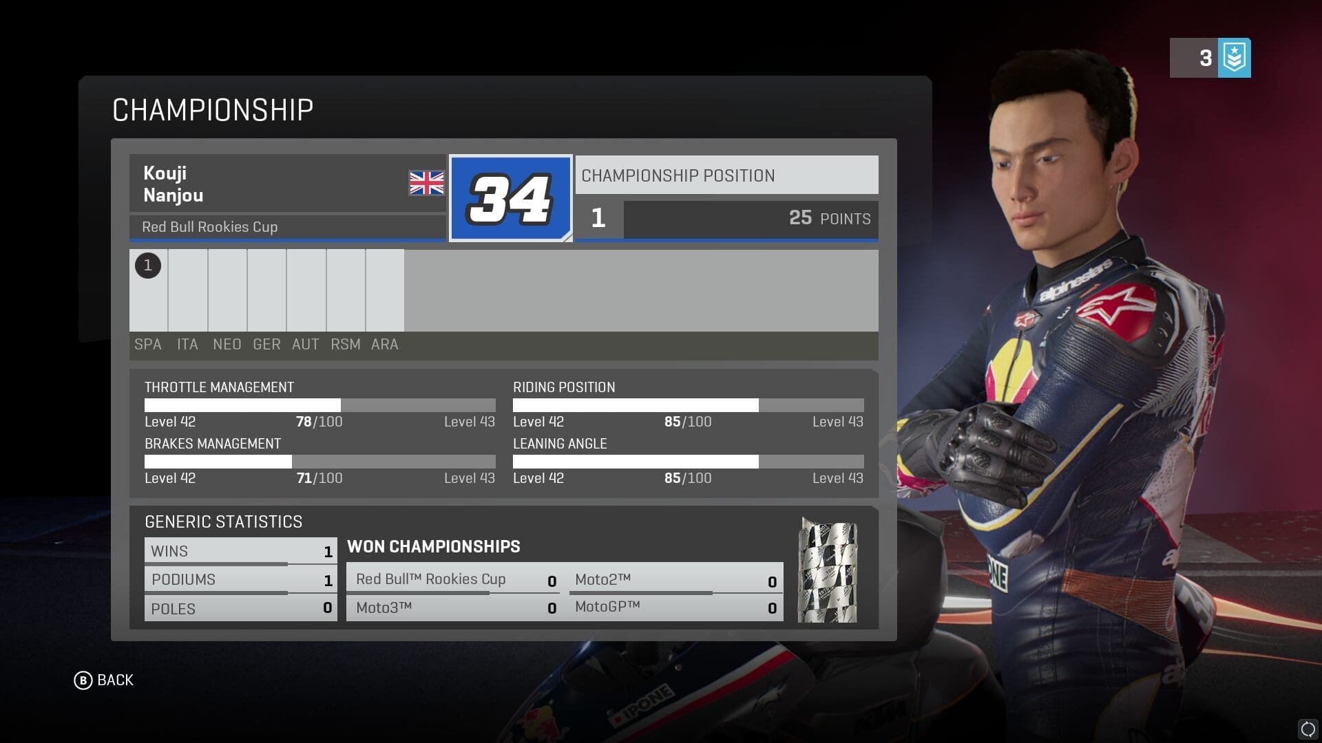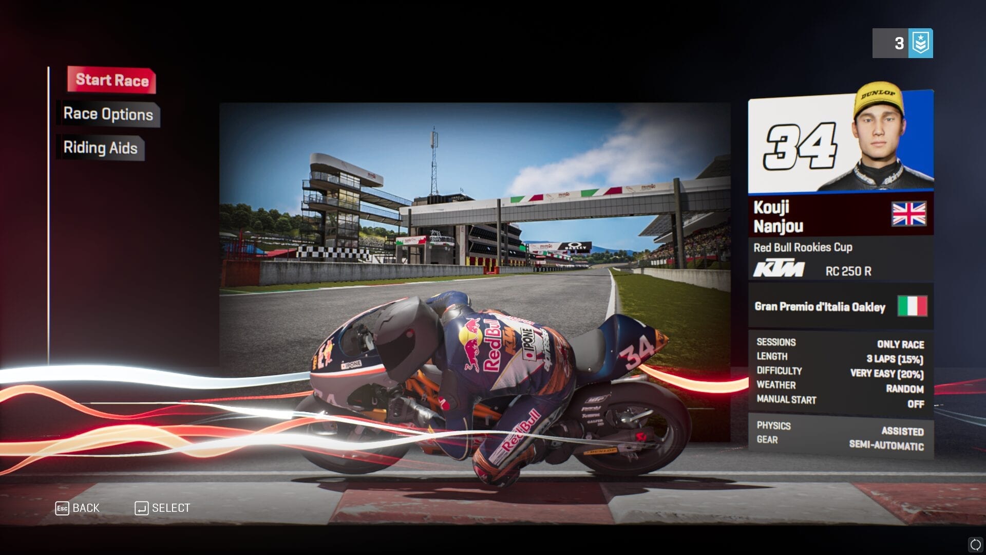 It couldn’t be simpler. The player starts a career in bike racing and moves through championship after championship in order to move up the ranks and possibly get a contract with a better team. The game is far from story-driven and mostly relies on the realistic driving experience to entice players. The career and reputation system (the EXP of this game) give it a nice framework to play out in.