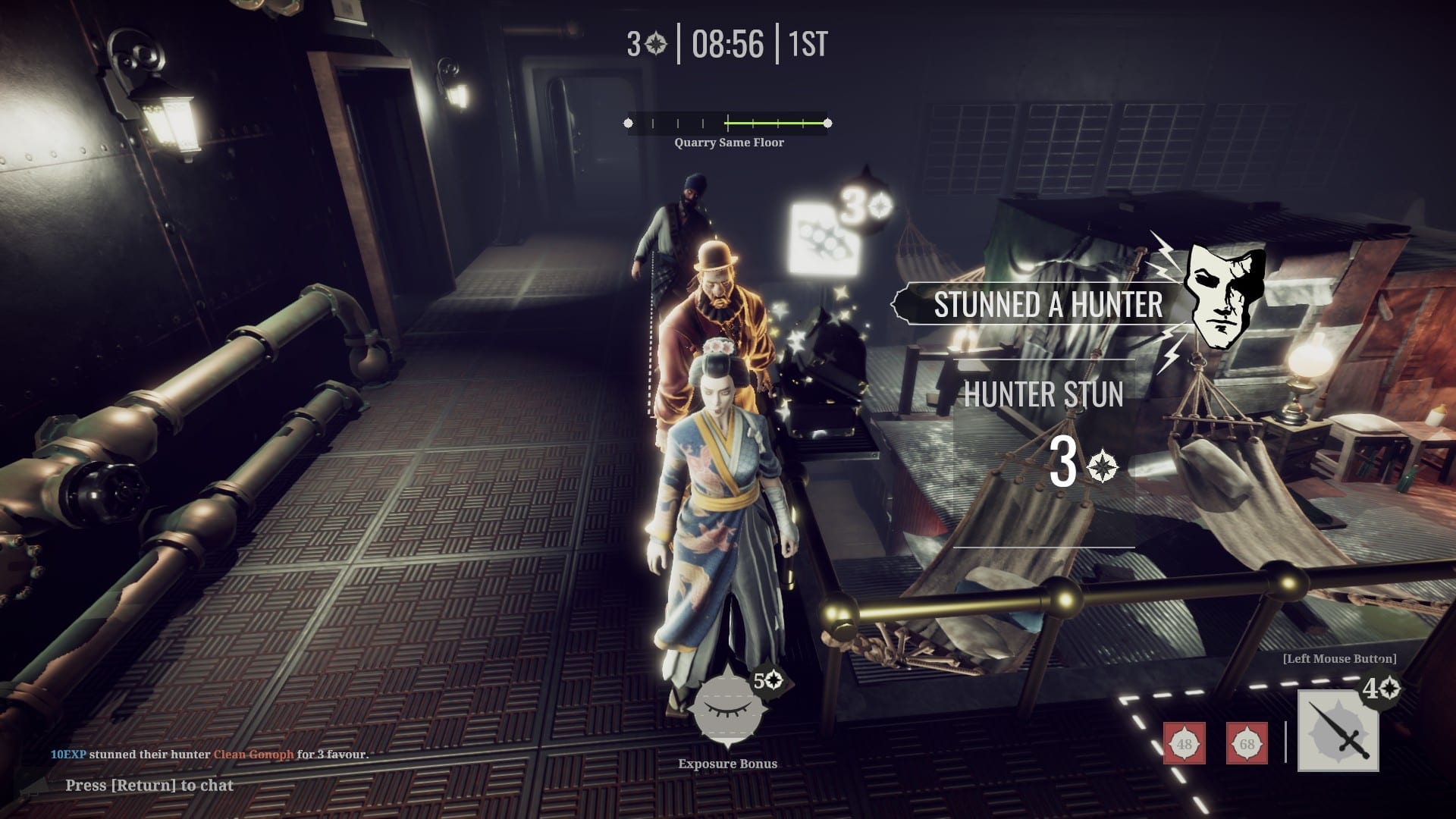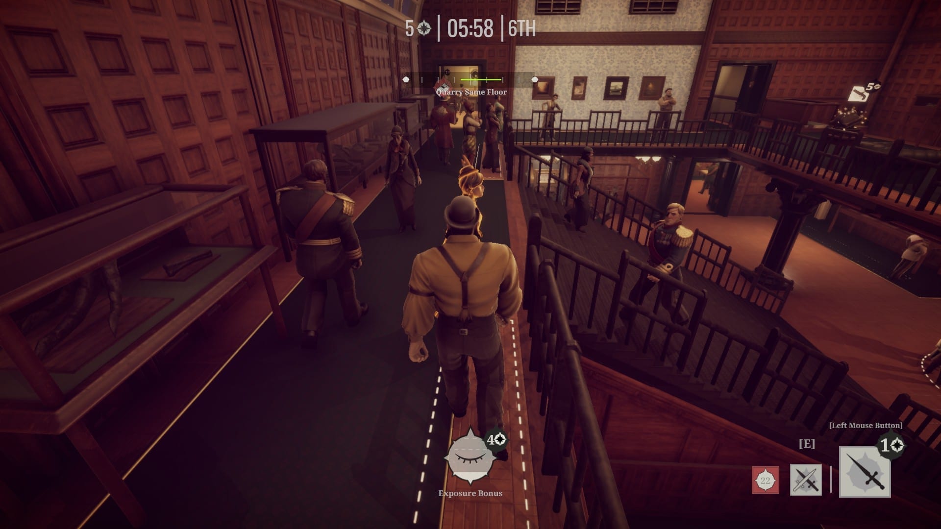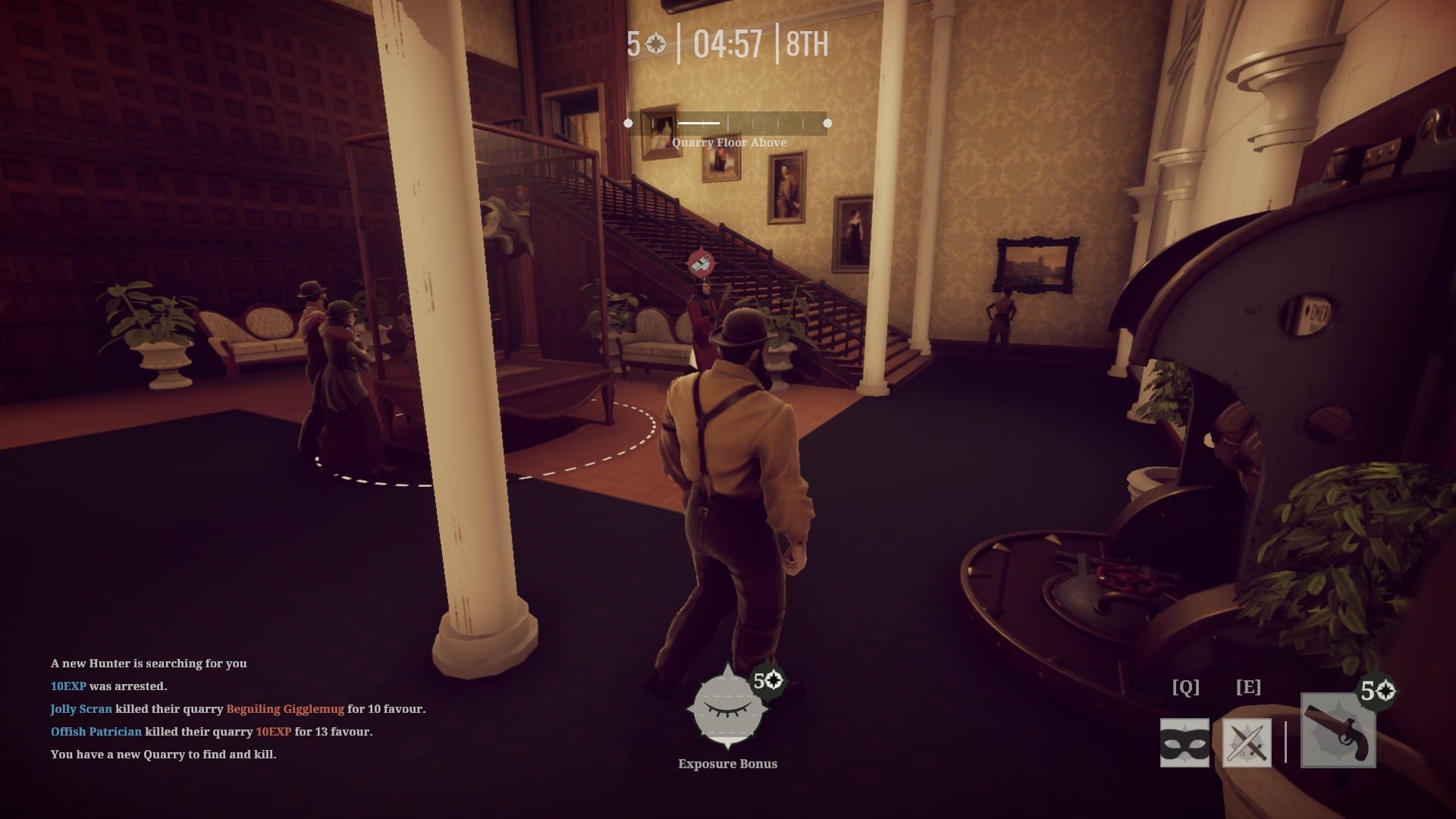 Murderous Pursuits also uses a stealth mechanic – if you run around or walk for too long without merging in with the crowds of people, your exposure goes up. When you kill your target, you get more points for having a lower exposure.