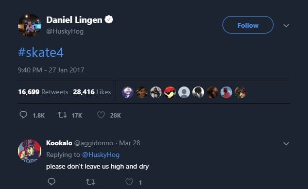 At the end of January 2017, the senior Manager of EA’s community management team tweeted ‘#skate4’. Everybody at EA denied that Skate 4 was being worked on, but this kind of Tweet doesn’t just get put up for no reason.