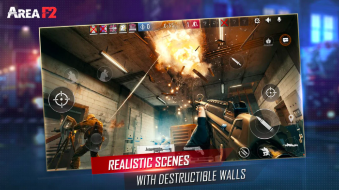 Area F2’s official description reads as follows: “In Area F2, the first Close-Quarters Battle (AKA CQB) shooting game on mobile, players fight over ultra-realistic environments as attacker and defender, playing as one of a wide selection of agents, each with own their special ability. All roofs and walls can be reinforced or destroyed, challenging players’ skills and tactics as every wall may become a potential entry point.”