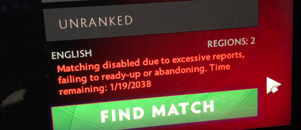 The news comes following a recent matchmaking update, with the year 2038 being the furthest-away date in the system. It seems as though this is Valve’s version of a life-long ban from Dota 2.
