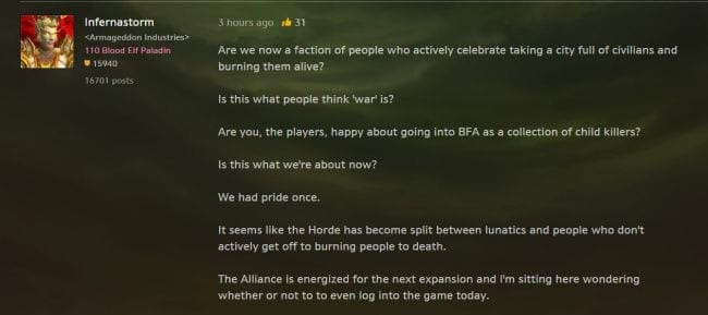 The Horde was previously – though not exactly good – not evil per se. Horde players especially were completely flabberghasted at this terrible writing and unwelcome plot twist, and they weren’t shy about letting Blizzard know.