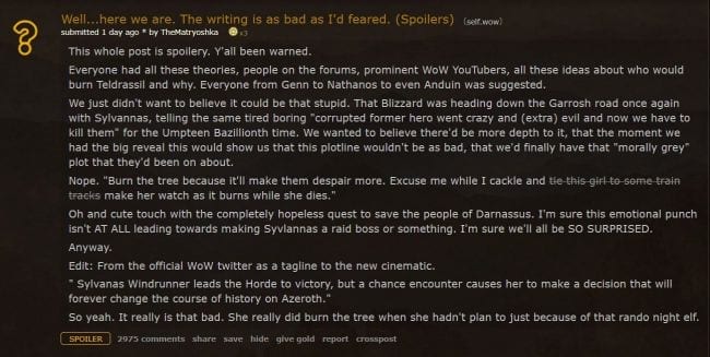 Yesterday, they released an animated short that reveals the culprit: Sylvanas Windrunner. Since this reveal, Reddit, forums, fansites and probably a carrier pigeon or three have been alight with outrage and disappointment at this development. Just about nobody is happy about the direction Blizzard is taking the story.