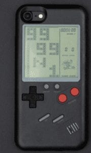 The description reads: “Big fun in a small package. Inspired by the iconic original game boy, the classic retro games handheld phone case features the world’s most popular video games in the form of a mobile phone case. Sit back relax and enjoy various classic games while trying to kill time. The Retro Phone Case provides a comfortable feel and grip with sensitive keys and easy operation. The ideal gift for self, family, friends, relatives, and gamers.”